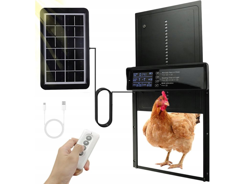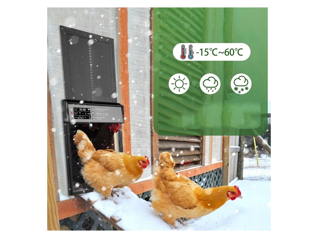 Automatické dvere do kurníku sú vybavené funkciou časovača, ktorá umožňuje automatické otváranie a zatváranie kurníku v určitom čase. Možnosť nastavenia otvárania podľa vonkajšieho svetla alebo časovača. Možnosť otvárania aj na diaľkové ovládanie.